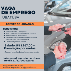 A locadora de veículos NOVA Aluguel está disponibilizando 01 (uma) vaga para Agente de Locação, em regime CLT, em Ubatuba.