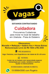 Procuramos Cuidadoras para morar no local de trabalho em Ubatuba – Praia do Estaleiro.
